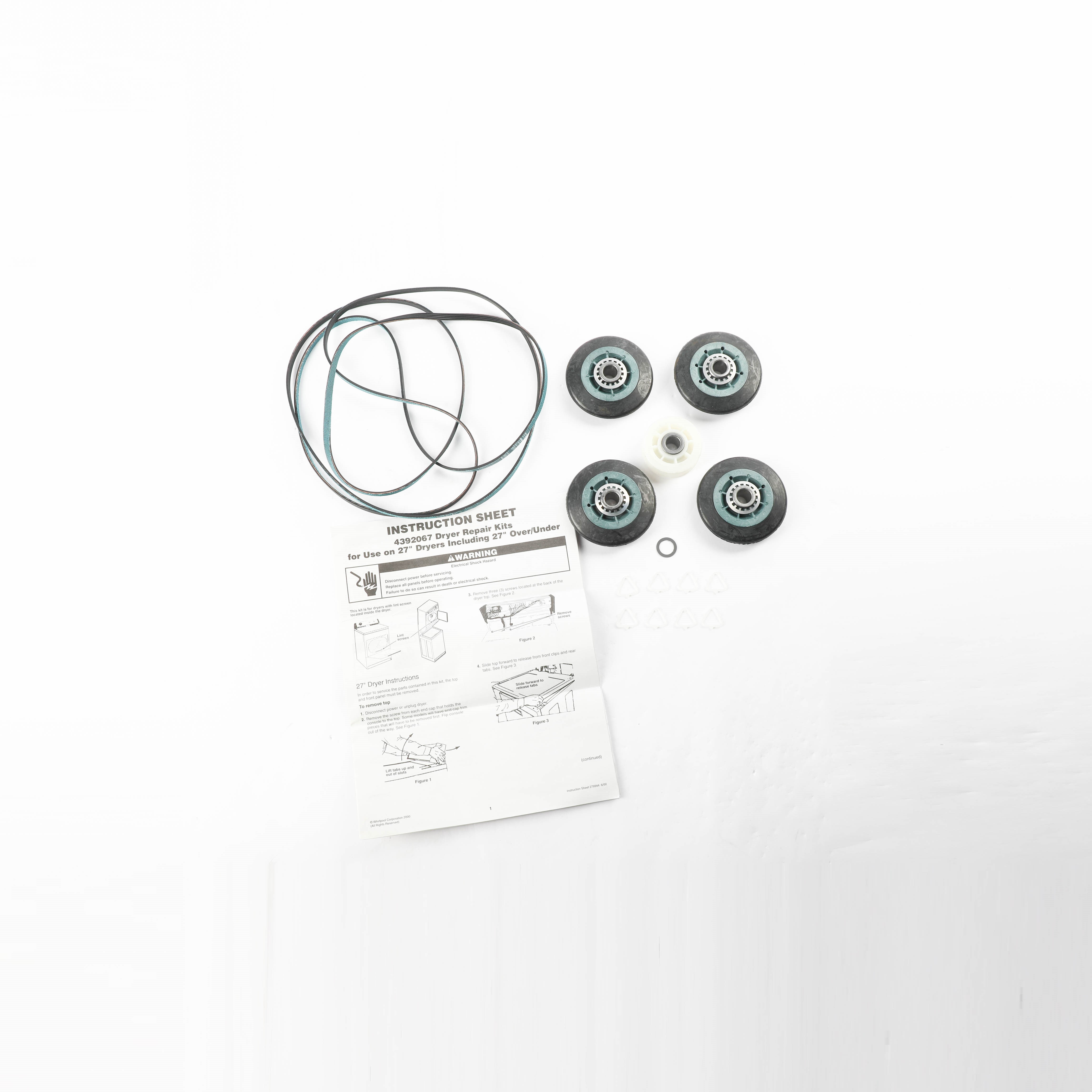 Dryer repair kit used with 27 inch dryer. It includes one (1) multi-rib belt part number 661570, four (4) drum support rollers part number 3396802, one (1) idler assembly part number 3388672, nine (9) tri-rings part number 690997, one (1) washer part number 2